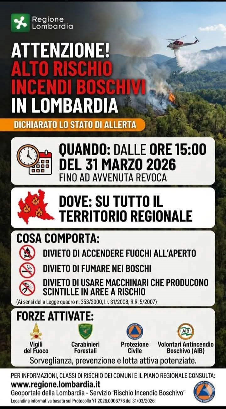Si comunica che Regione Lombardia ha emanato il TERMINE DEL PERIODO AD ALTO RISCHIO PER GLI INCENDI BOSCHIVI a partire dal giorno 13 aprile 2026. Di...